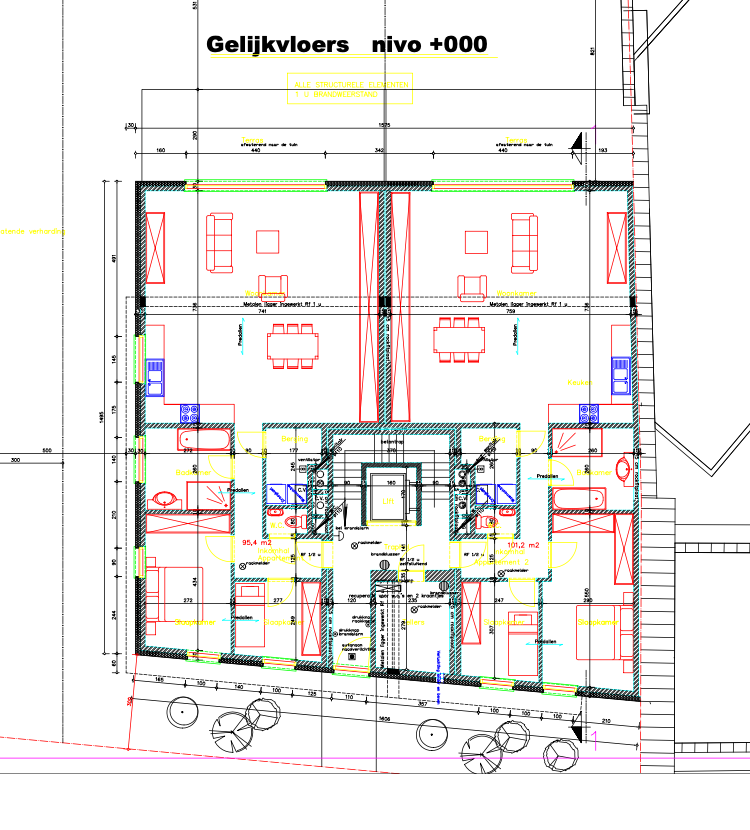 Op het gelijkvloers is de gemeenschappelijke inkomhal met lift, trap en 2 appartementen. Deze hebben beide een terras, die overgaan in 2 privé-tuinen.