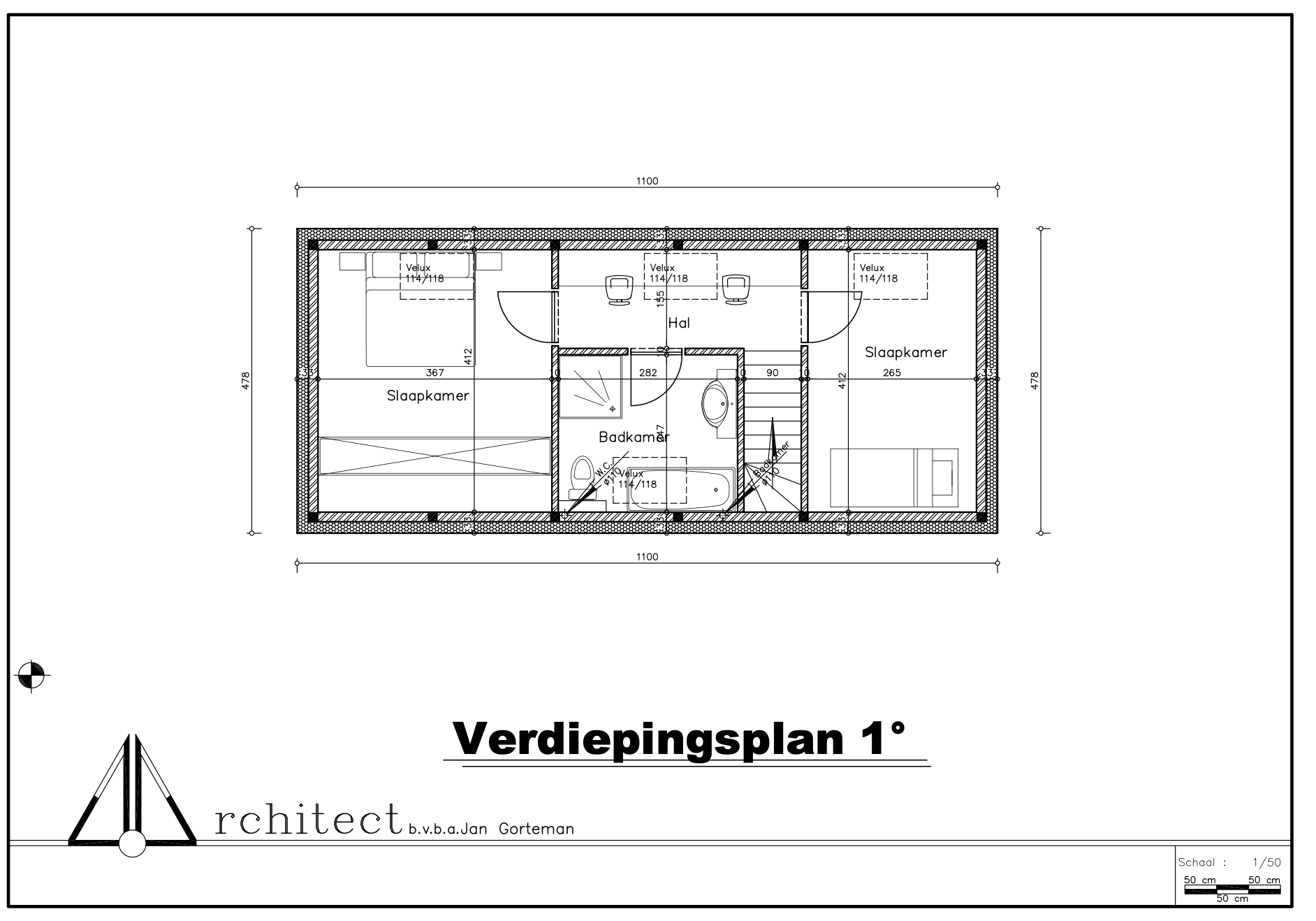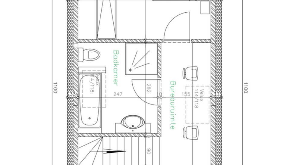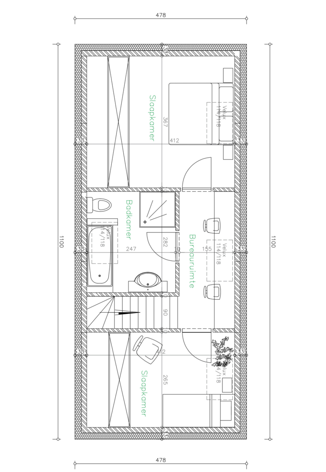 Op de verdieping tref je centraal de nachthal en een ruime badkamer met ligbad, douche, lavabomeubel en toilet. Daarnaast heb je twee slaapkamers.