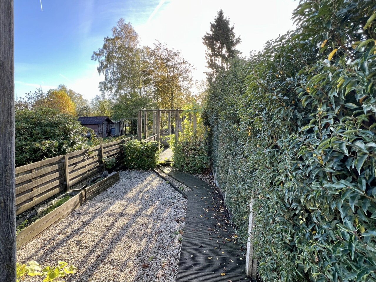 Er is een afzonderlijke gang aanwezig, die toegang geeft tot de woning en de tuin.