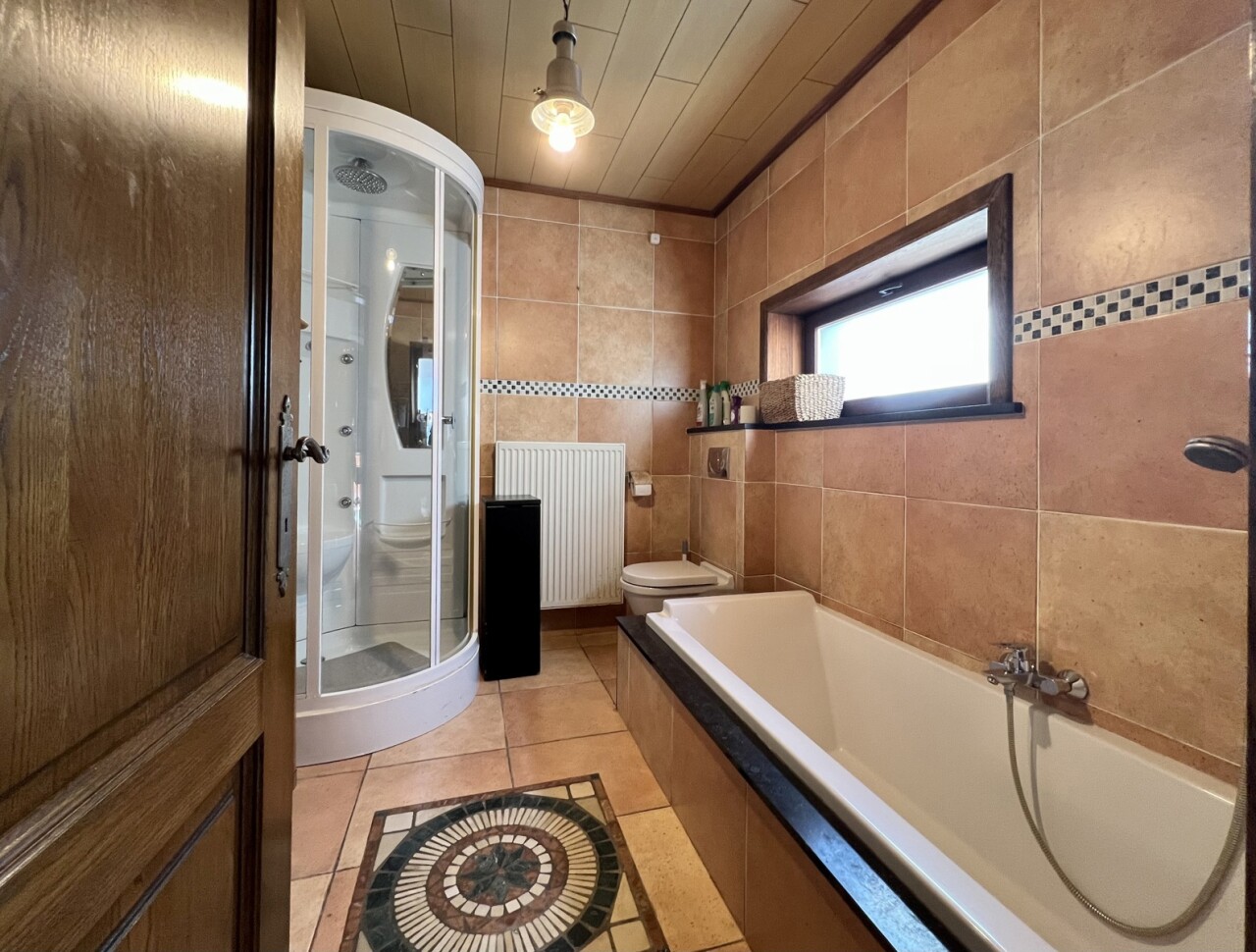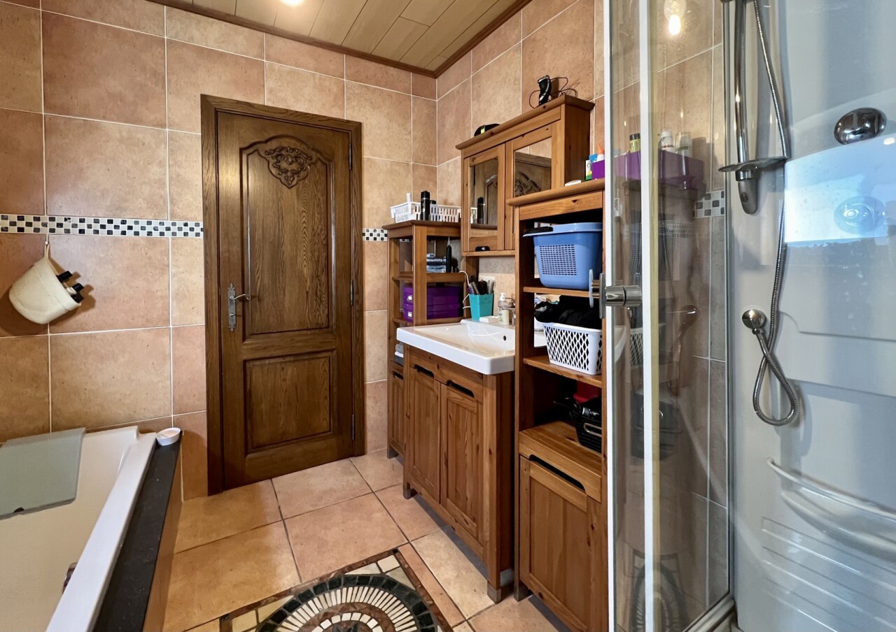 Op het gelijkvloers bevindt zich ook de badkamer met ligbad, douche, toilet en lavabomeubel.