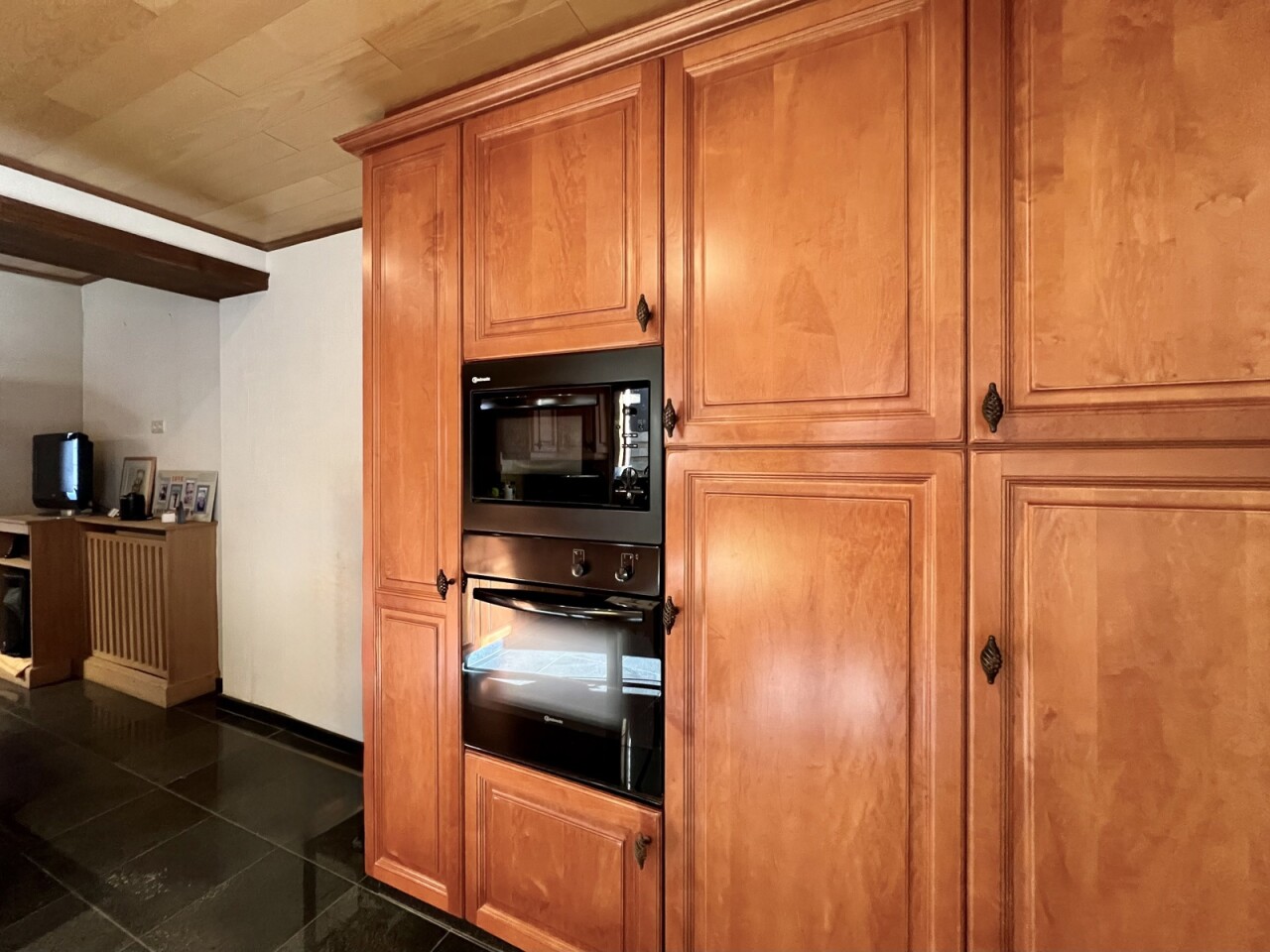 De zichtbare houten gebinten geven een landelijk gevoel, alsook de nieuwe tegel- en laminaatvloeren op elke verdieping en de massieve deuren op het gelijkvloers.