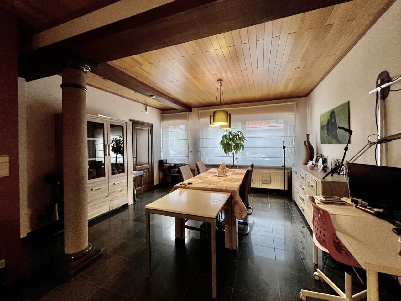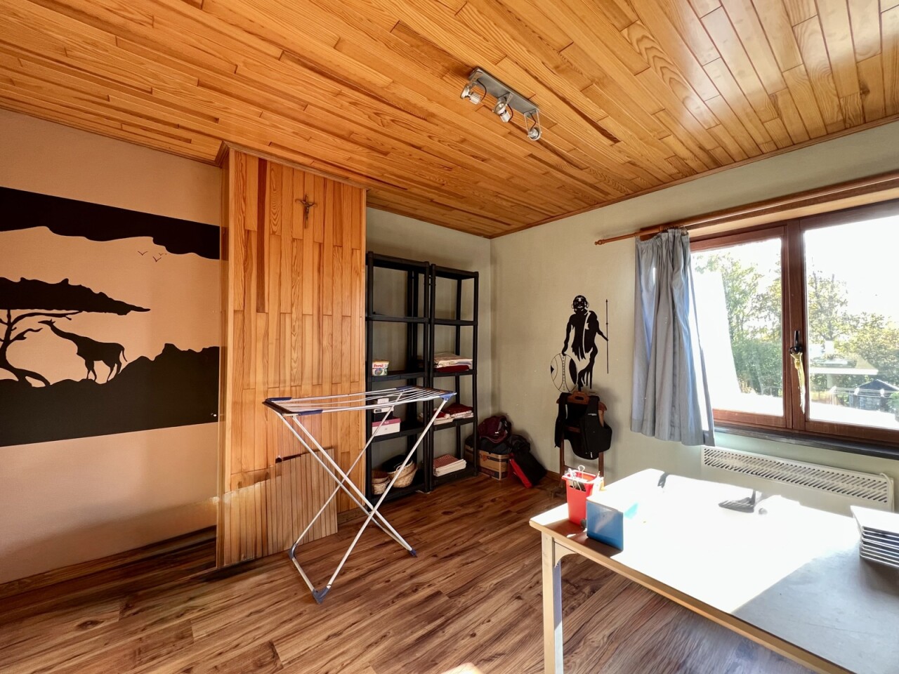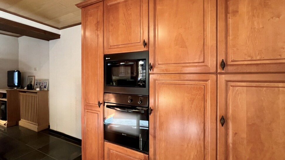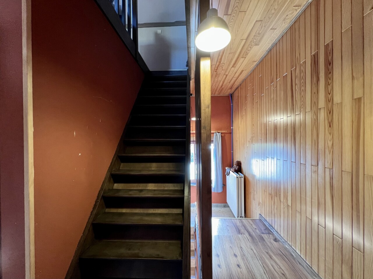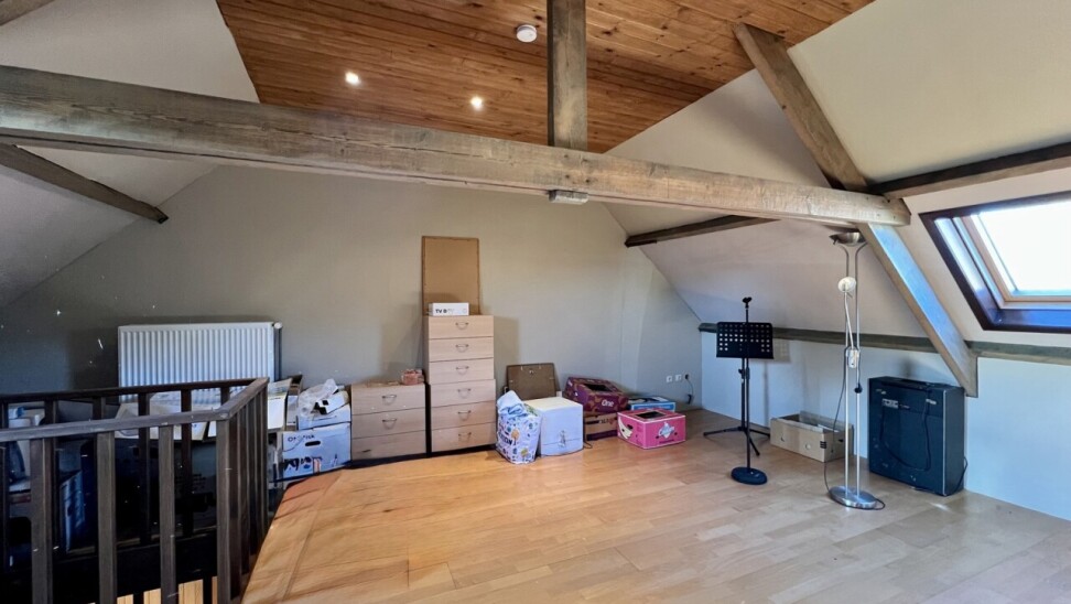De zichtbare houten gebinten geven een landelijk gevoel, alsook de nieuwe tegel- en laminaatvloeren op elke verdieping en de massieve deuren op het gelijkvloers.