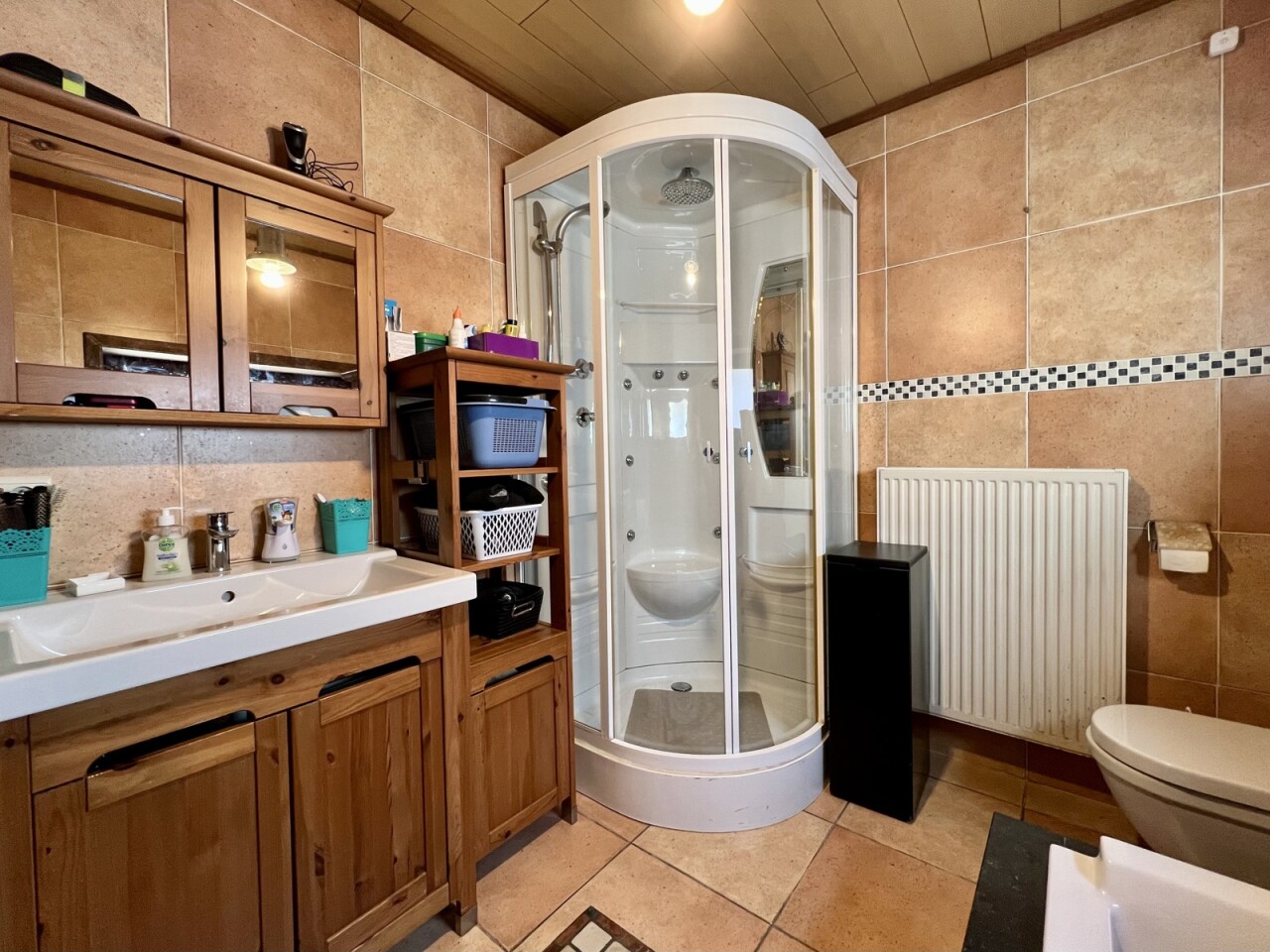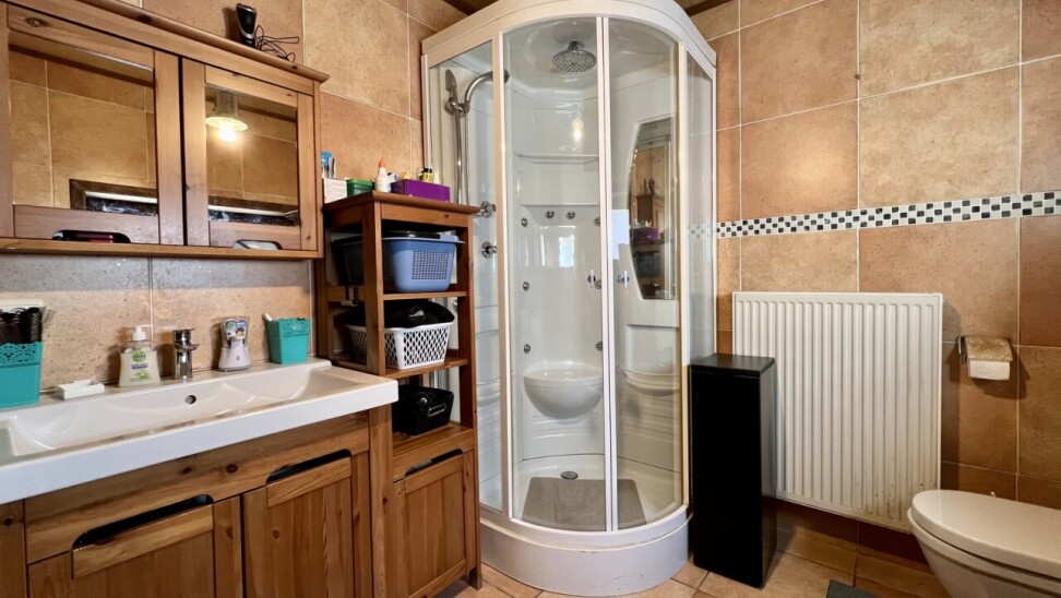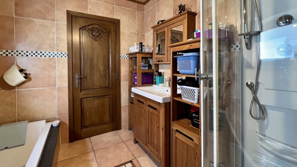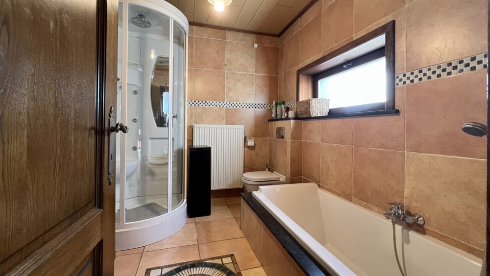 Op het gelijkvloers bevindt zich ook de badkamer met ligbad, douche, toilet en lavabomeubel.