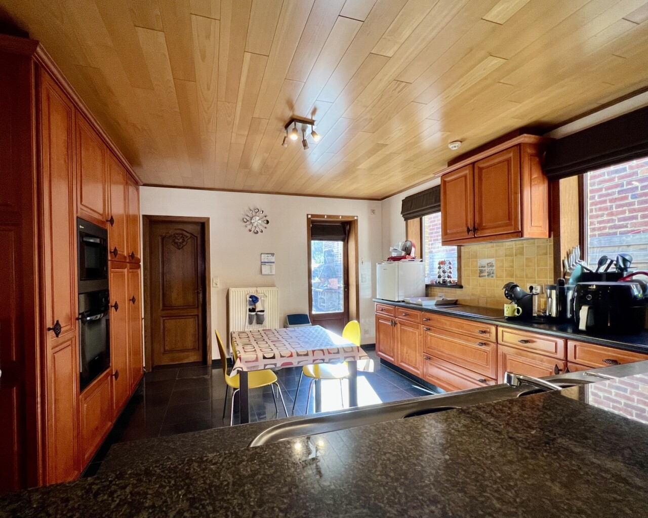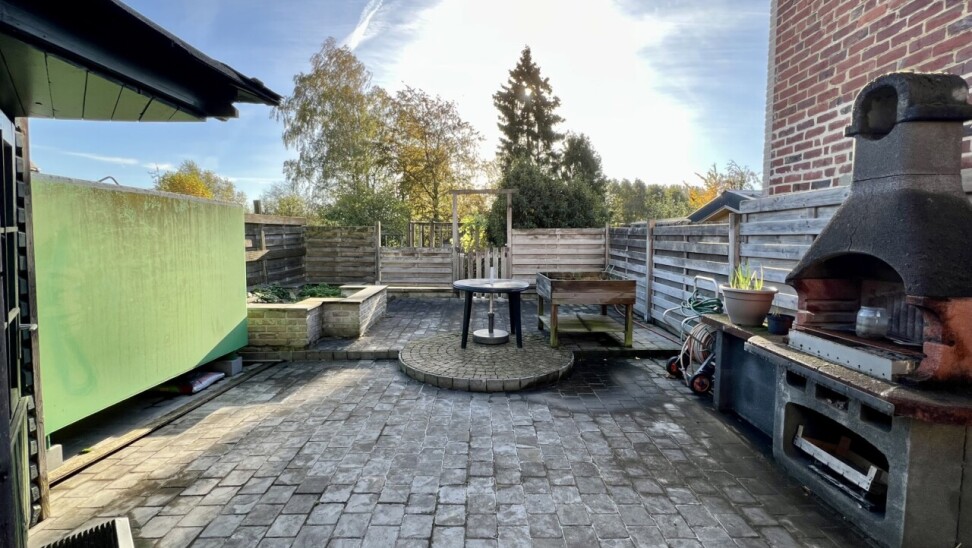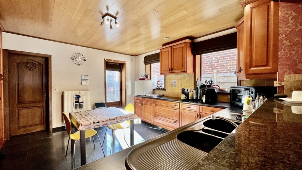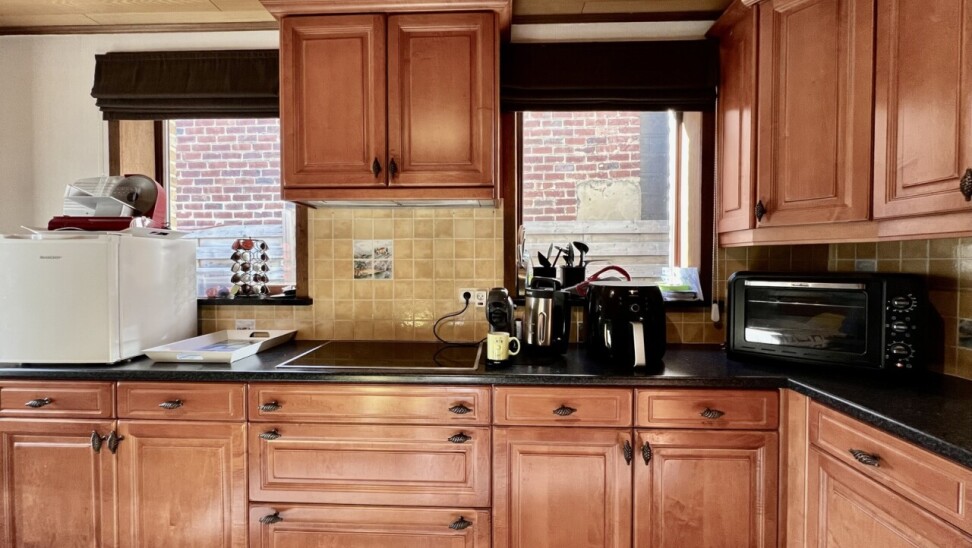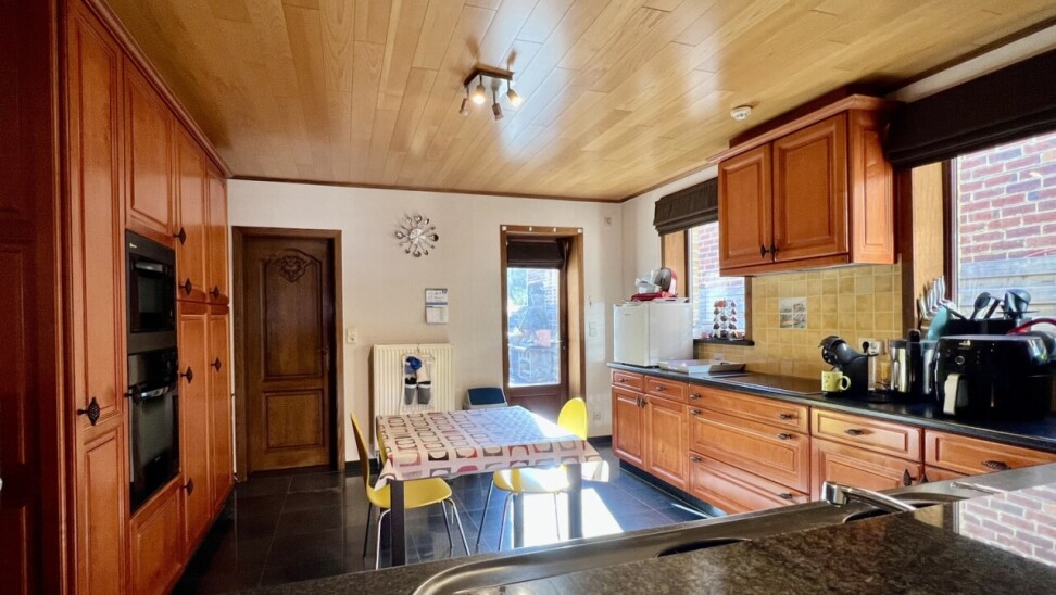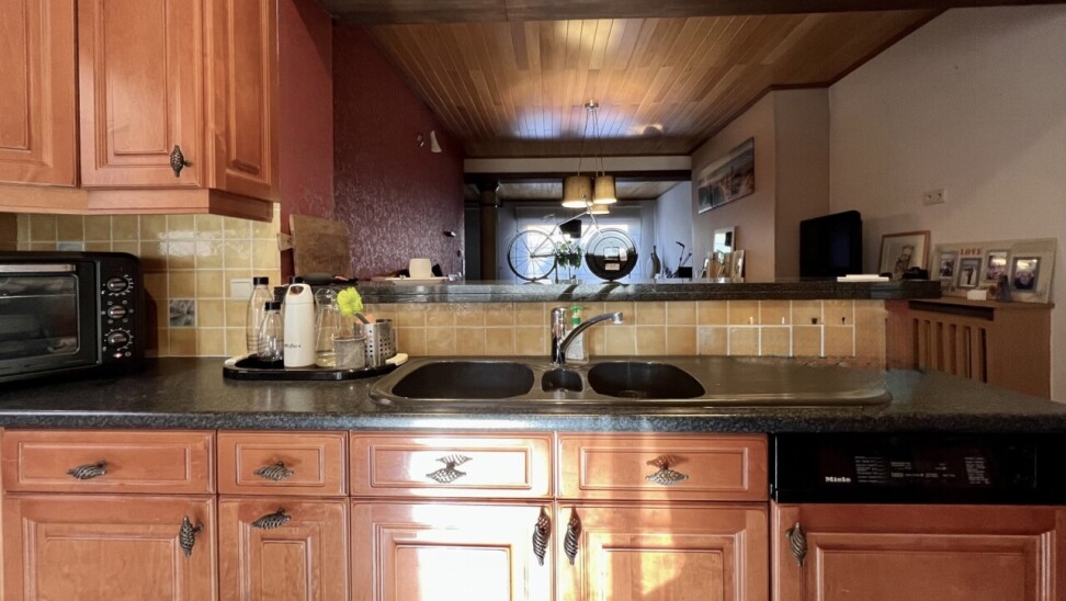 De keuken geeft ook toegang tot de achtergelegen ruime terrassen en afgesloten tuin met 2 tuinbergingen.
