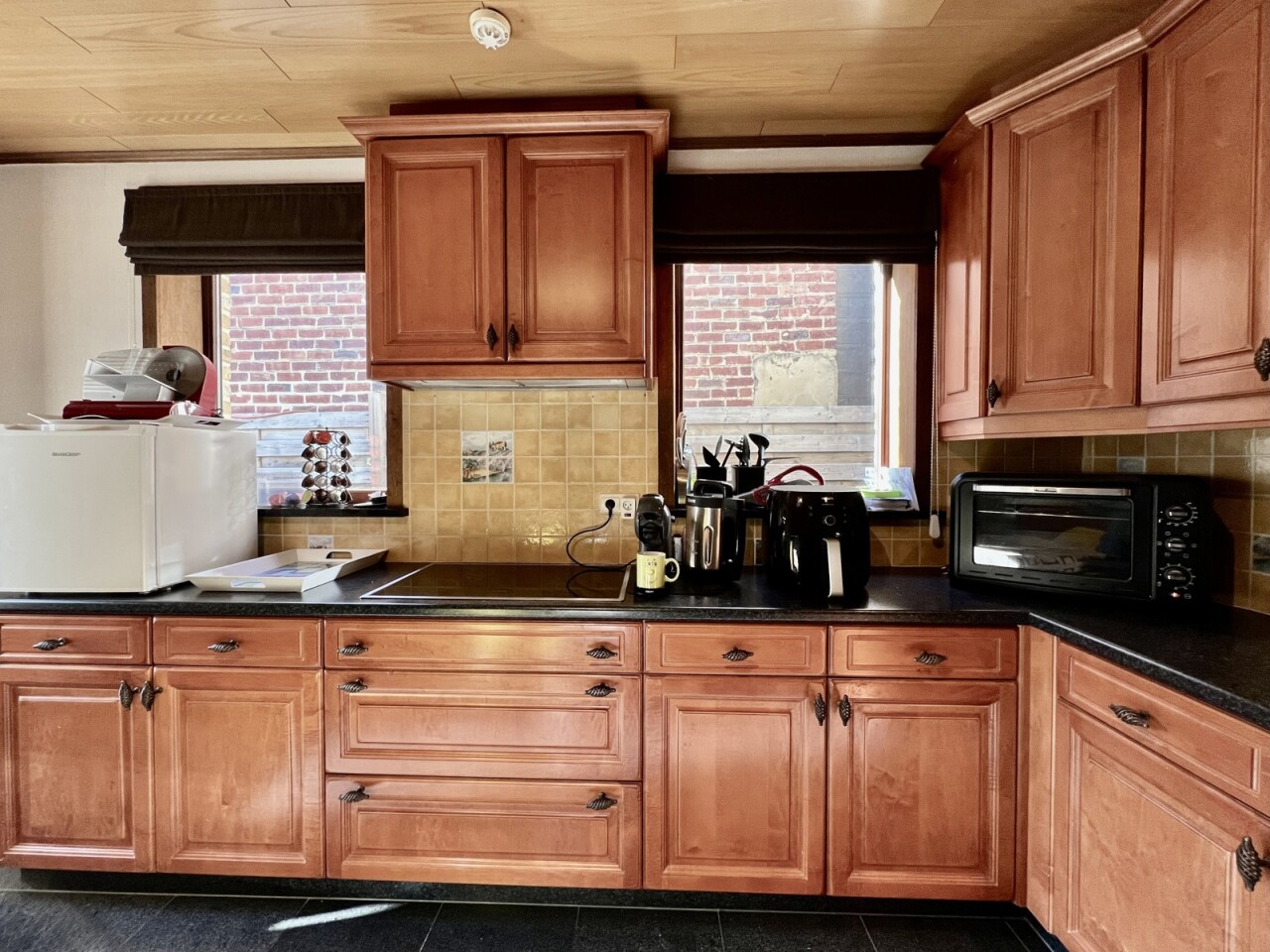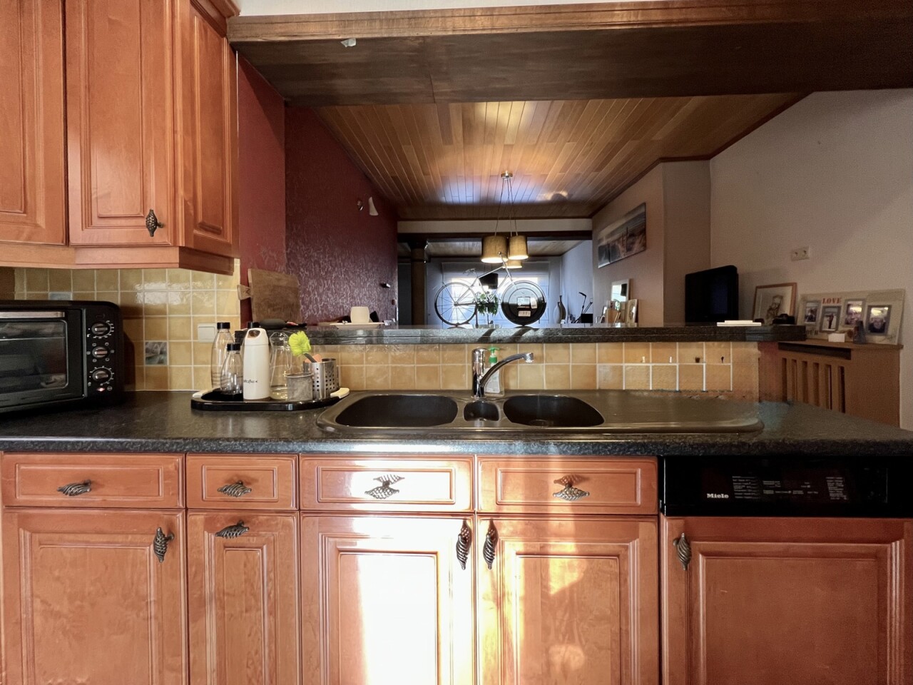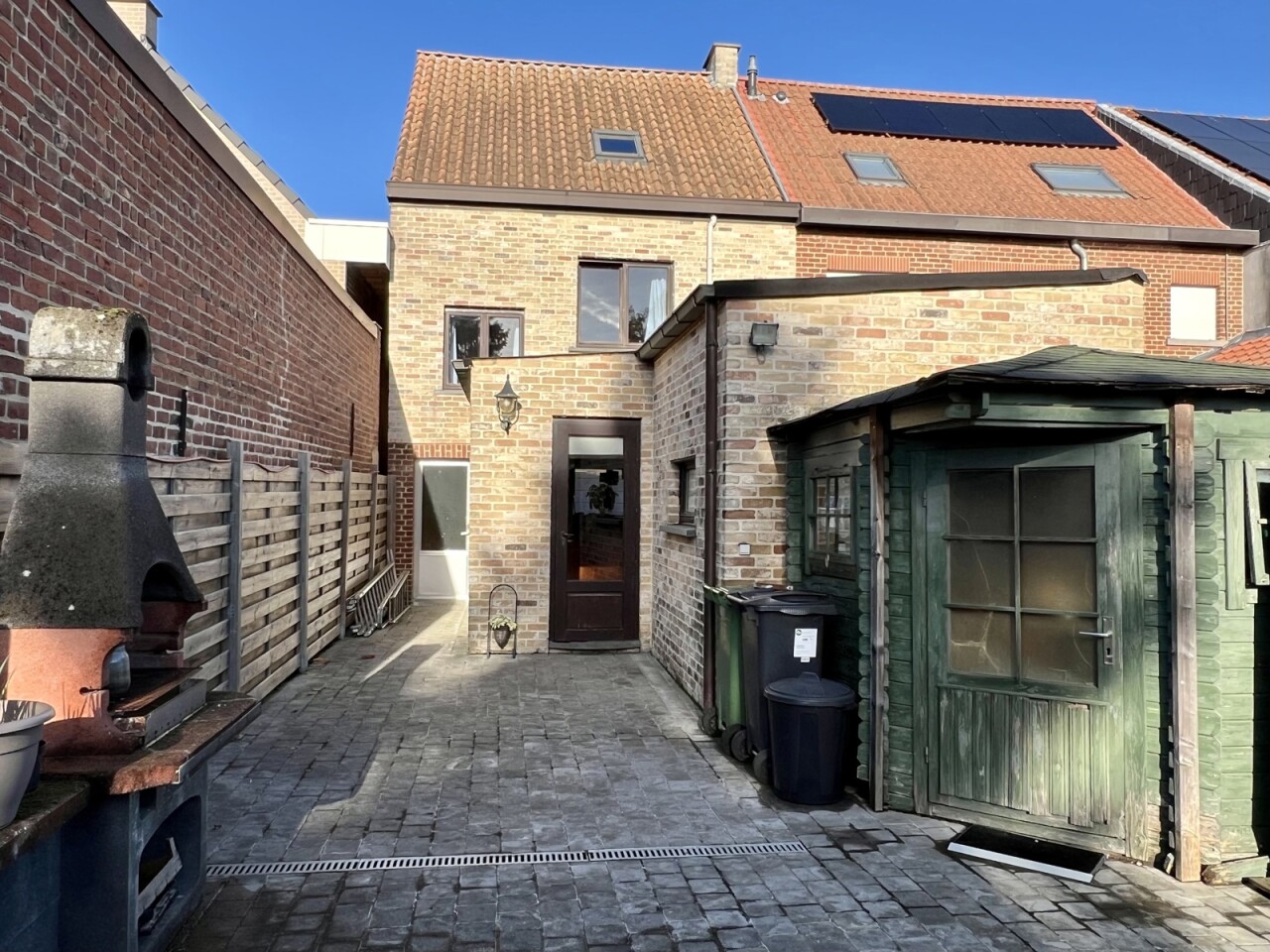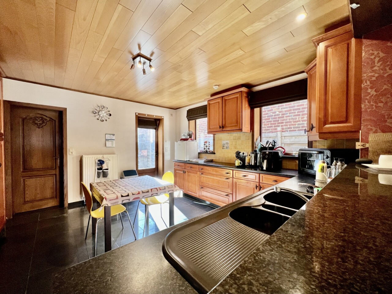 De keuken geeft ook toegang tot de achtergelegen ruime terrassen en afgesloten tuin met 2 tuinbergingen.