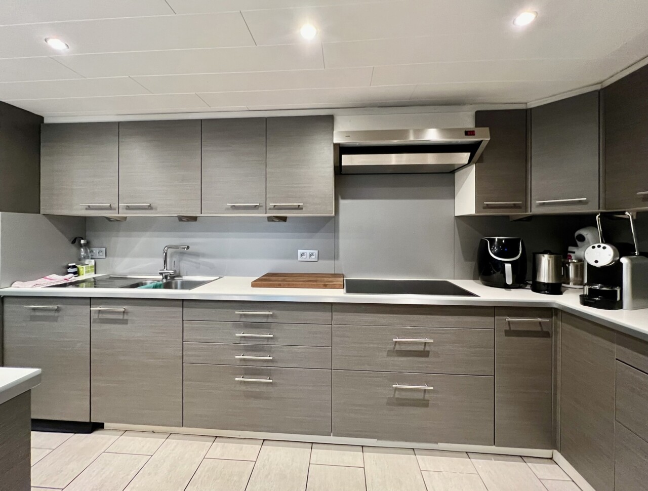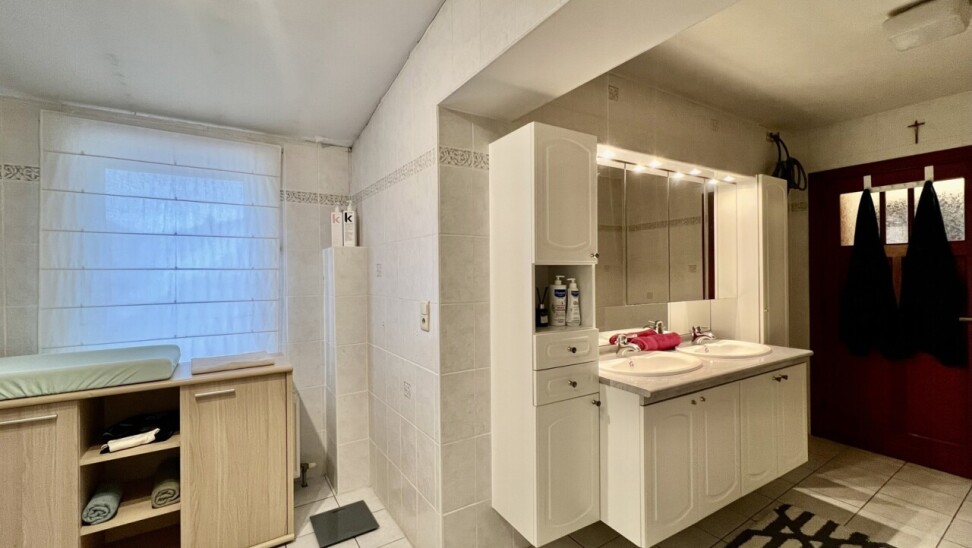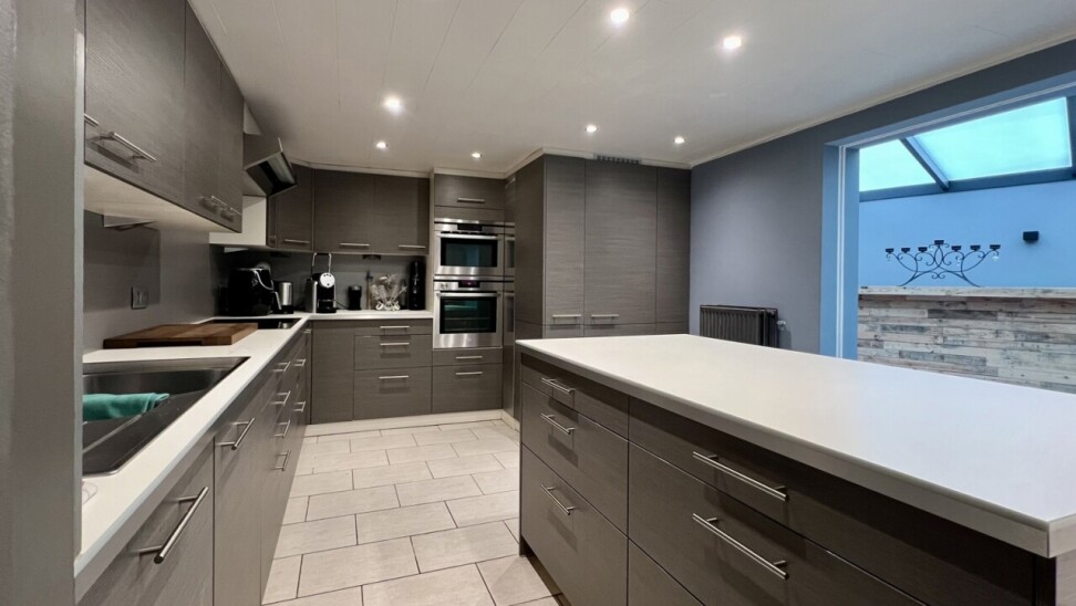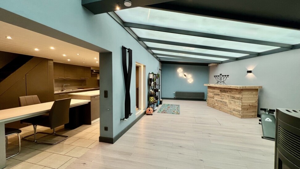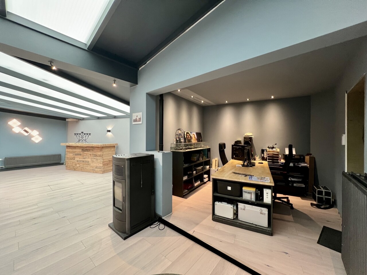 Via de inkomhal met gastentoilet heb je toegang tot eventueel 2 polyvalente ruimtes (ook als extra leefruimtes te gebruiken), ideaal voor een zelfstandig beroep of praktijk aan huis (mits vergunning). Verder vind je op het gelijkvloers een grote leefruimte met deels open, volledig geïnstalleerde keuken (vaatwas, dampkap, spoelbak, frigo, stoomoven en microgolfoven), een afzonderlijk toilet, praktische bergingen + wasruimte, en een bureauruimte.